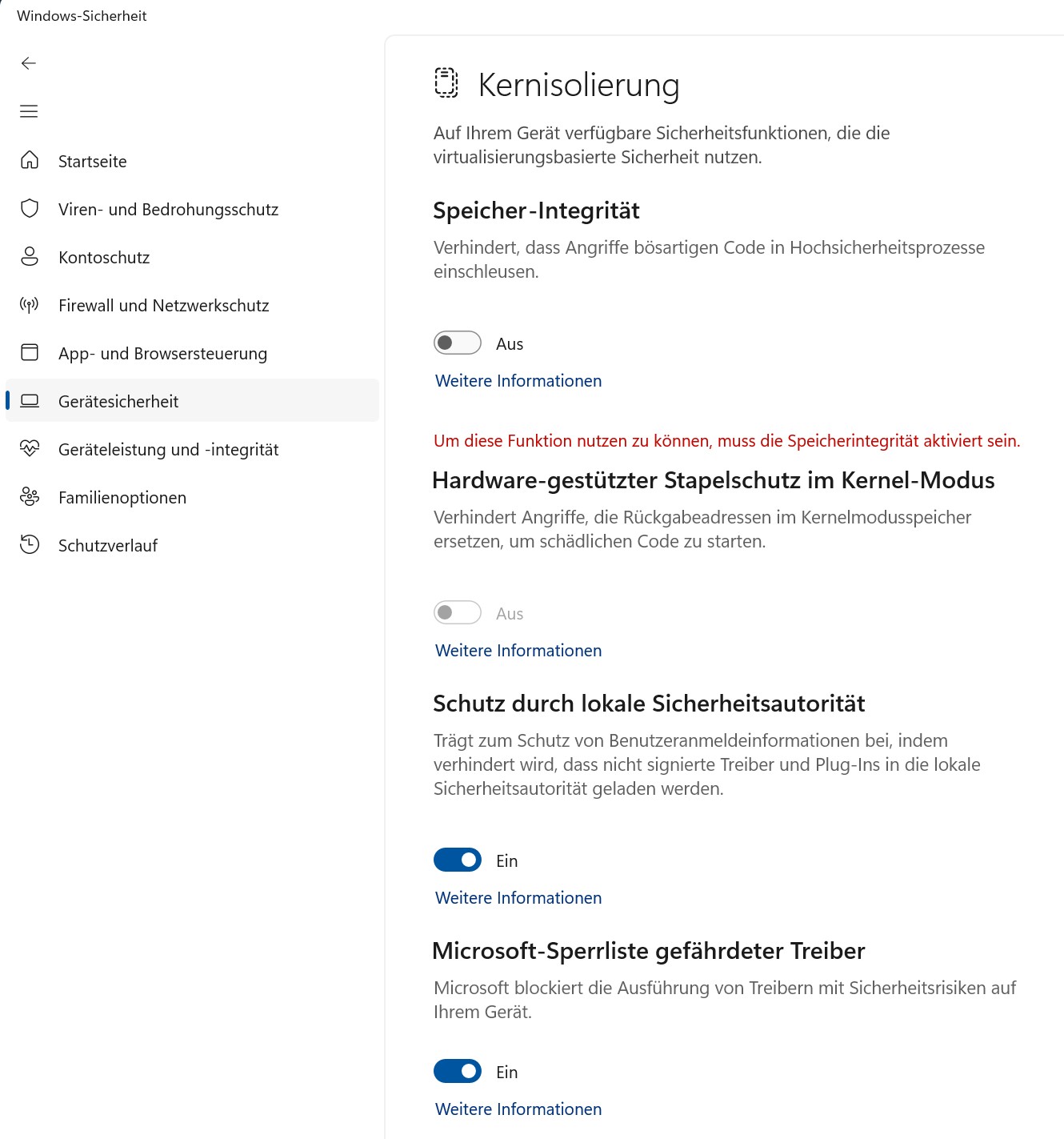Öffne Windows-Sicherheit → Gerätesicherheit → Core-Isolation Details